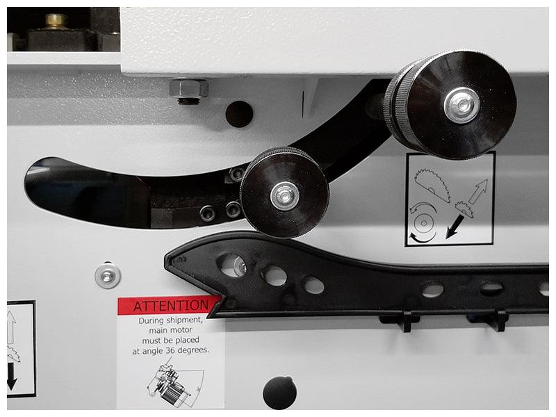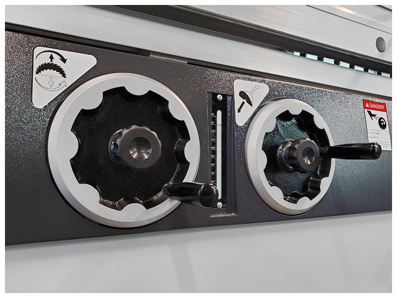 - Manual saw blade rise/fall & tilting, conveniently located on the operator side of the machine