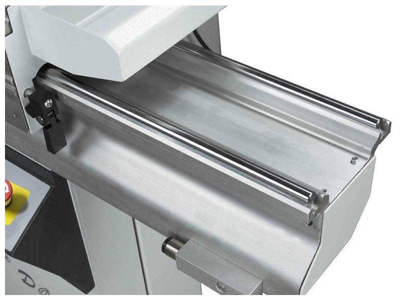 - Heavy duty rip fence runs on round cylindrical solid steel guide with manual adjustment and micro adjustment knob