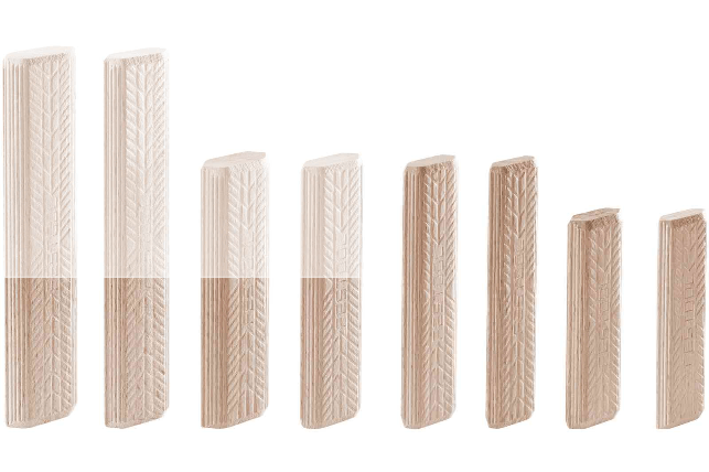 8mm x 80mm beech tenons, includes 190 pieces. Rotation-proof, solid wood DOMINO Tenons fit precisely in the mortise created by the tool, with glue expansion slots designed into their surface to ensure a solid, generations-lasting joint. Made from solid hardwood stock, DOMINO Beech tenons form the basis for strong joints that will last a lifetime and beyond.