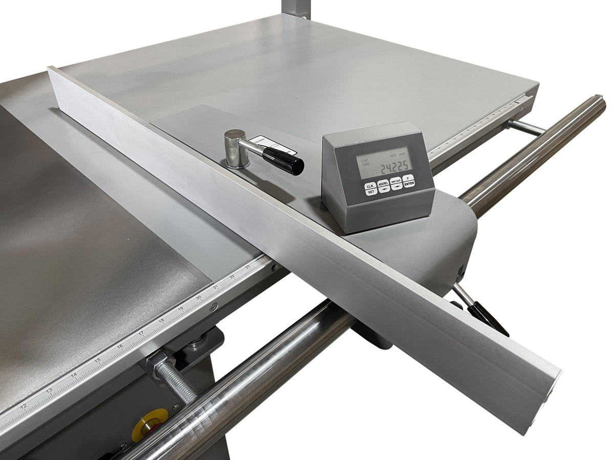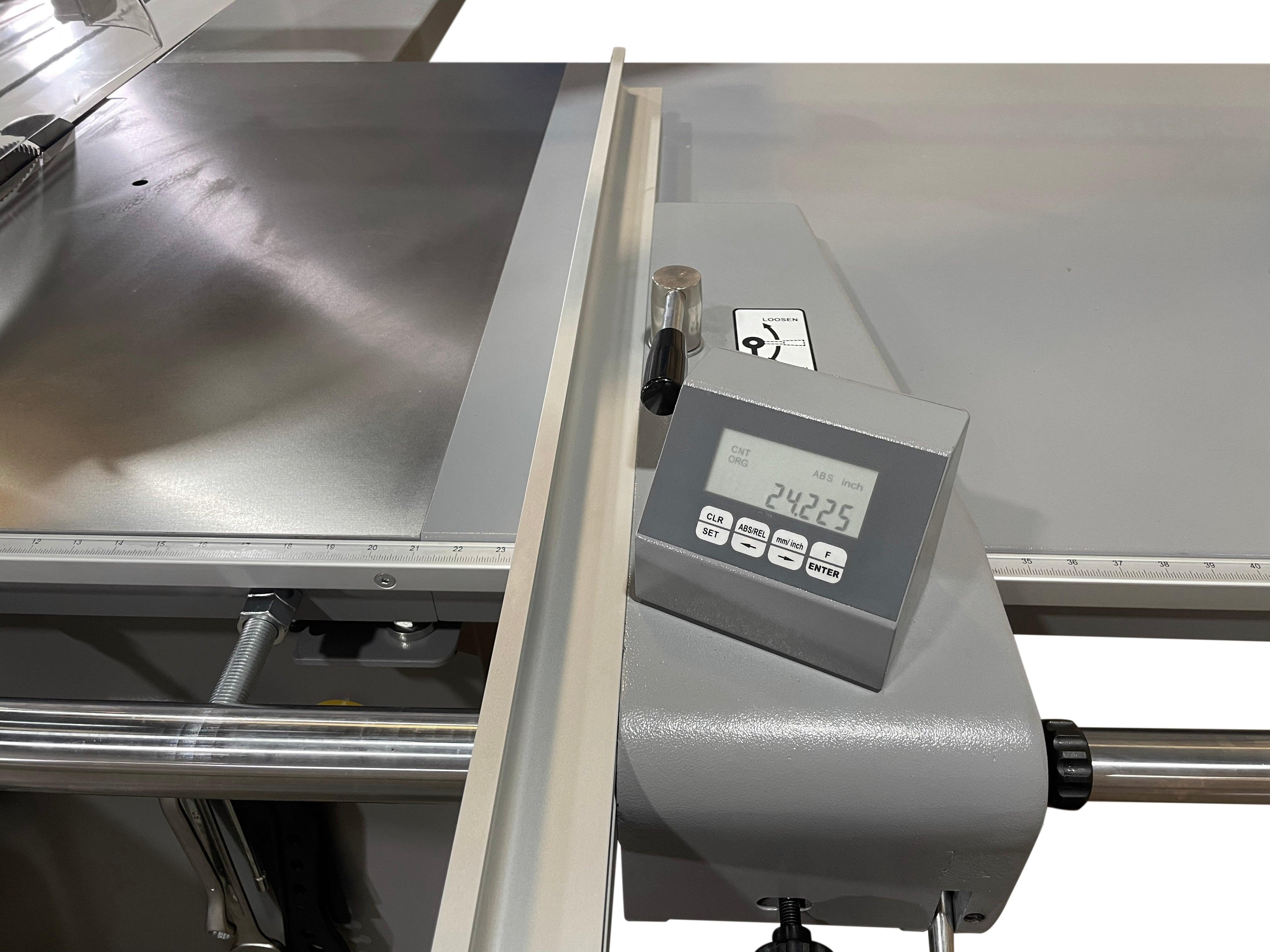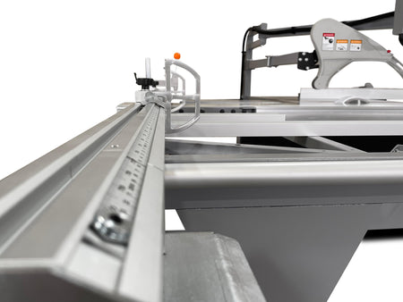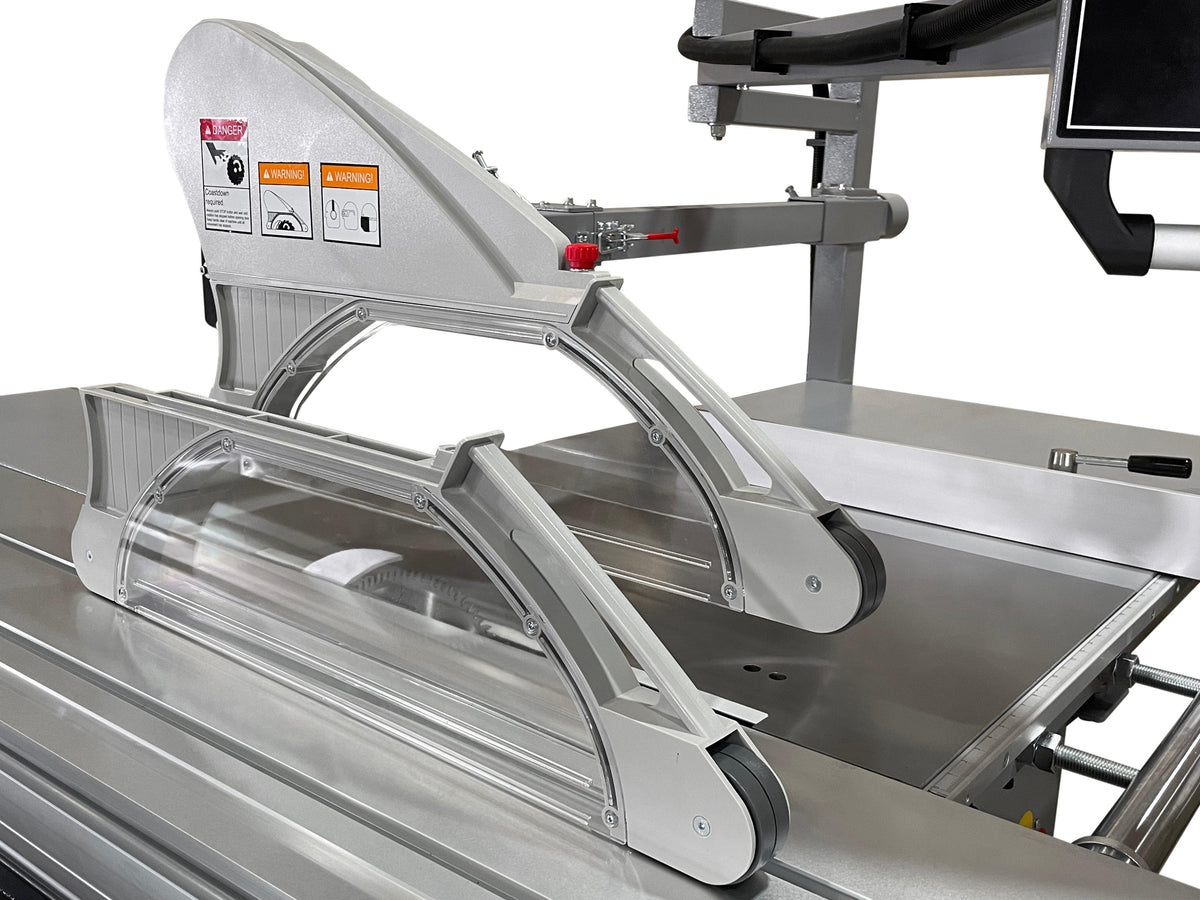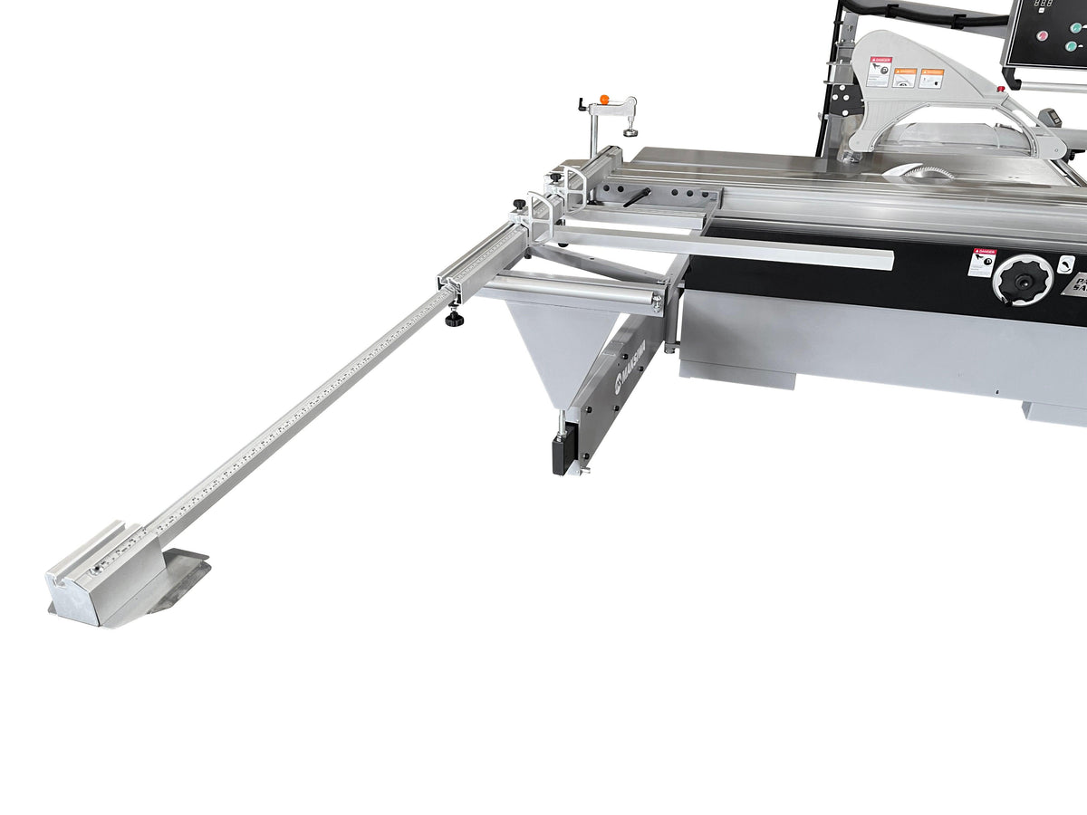 The BMP.3200.IR Platinum is the most powerful sliding panel saw on our line, equipped with a 7.5HP main motor and ¾ HP Scoring motor (3 phase). The 126” sliding table is constructed of anodized aluminum and runs on precision linear guide rails that gives you an ultra-smooth movement allowing you to move the table effortlessly. Designed with a European style 51″ rip fence, it has a digital readout with a micro adjustment for fine-tuning; simply lock it in place and adjust fence incrementally. The rip fence consists of a heavy-duty casting riding on a micro-polished solid steel bar. Our heavy-duty anodized aluminum crosscut fence features two solid flip-stops, telescoping function (max 140″), 45° miter and is ergonomically designed to make it easier to read the tape. The machine comes standard with two overhead guards 90° and 45° featuring a quick-change and swing-away function, easily switch from one to the other in a matter of seconds and move the guard out of the way easily if necessary. It also includes a push handle, hold-down clamp and wedge clamp.