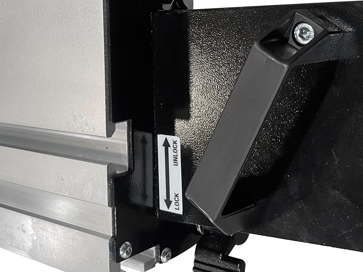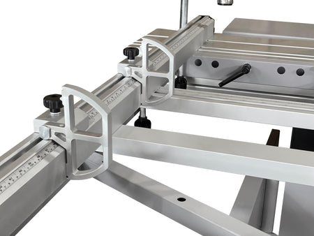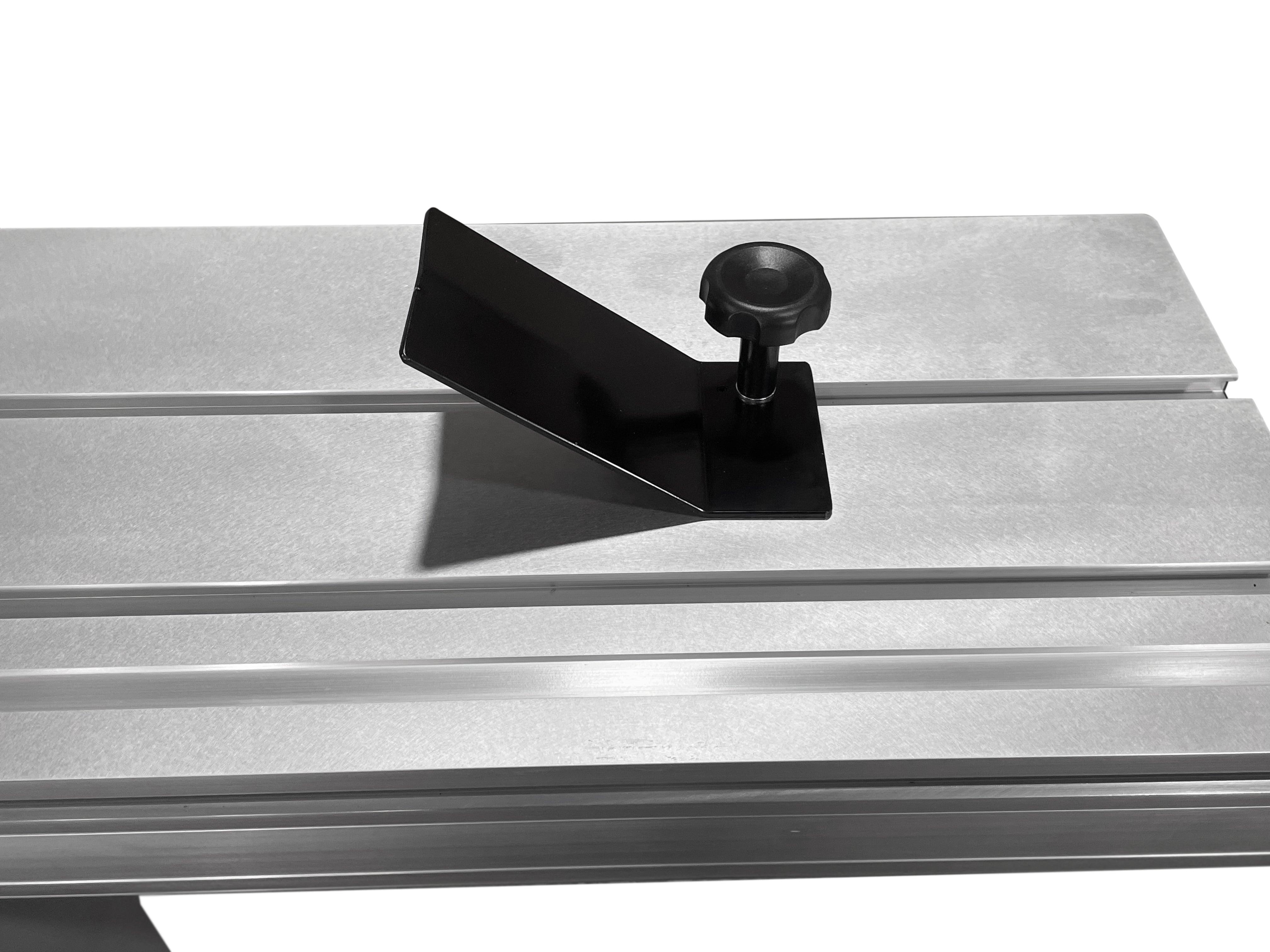 - Aluminum extruded crosscut fence with (2) flip stops with convenient angle adjustment for miter cuts