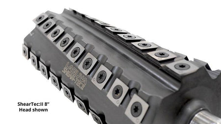 - ShearTec II Cutterhead - The ShearTec II cuttherhead comes as standard equipment on PX|16 Planer. The ShearTec II is a 6-row carbide insert cutterhead that produces a superior surface finish on all woods including challenging hardwoods. The ShearTec II knives and fasteners have a T-step design to maximize clamping force on the knives preventing knife cracking and chatter. The 4-sided carbide insert knives produce a shear cut for flawless results. The ShearTec II cutterhead has deep grooves that make the cutterhead very quiet and improve shaving ejection. The 4-sided knives can be rotated for a new cutting edge without the need for a knife setting jig